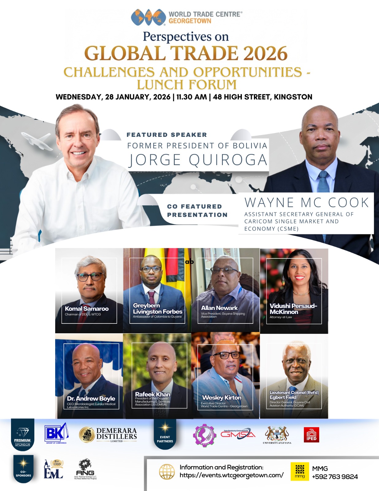 Hosted by the World Trade Centre Georgetown, the event will feature expert insights, high-level dialogue, and panel discussions focused on trade policy, logistics, market integration, and economic resilience. Attendees will gain valuable perspectives on emerging opportunities, strategic challenges, and the future of global and regional commerce.